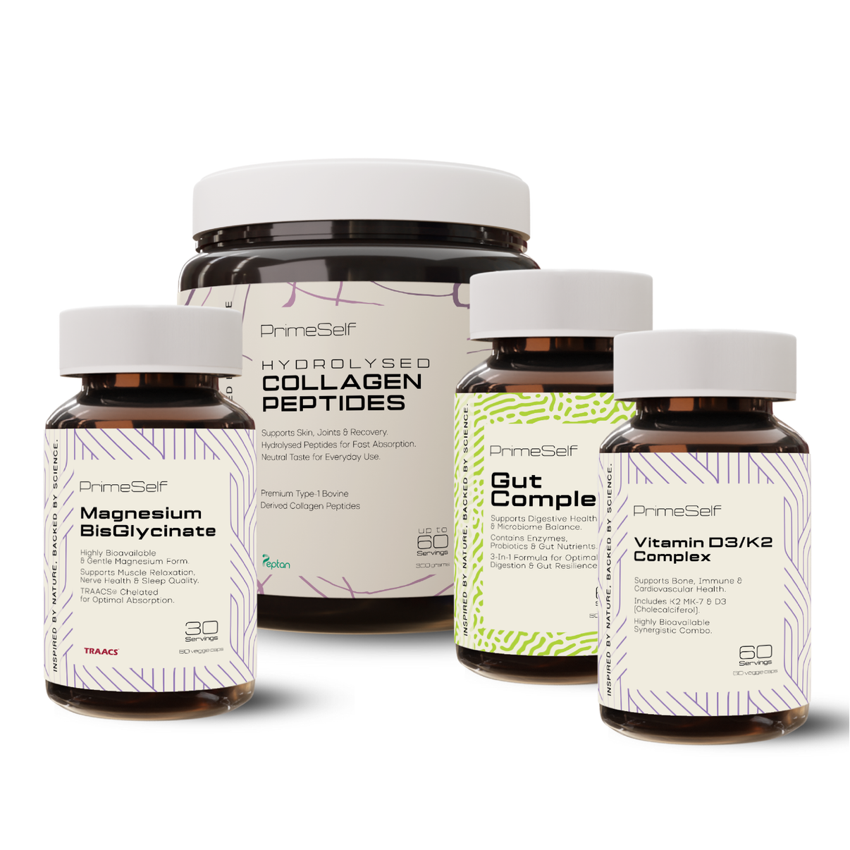 The Women's Glow Stack is built around four pillars: structural protein, gut integrity, nervous system recovery, and foundational micronutrient support. Hydrolysed Collagen Peptides provide premium Type I bovine collagen in a tasteless, neutral powder that mixes into anything - supporting skin elasticity, hair strength, nail integrity, and joint health. Gut Complex provides a comprehensive blend of probiotics, prebiotics, and digestive enzymes to support a healthy gut microbiome, which underpins everything from nutrient absorption to mood and immune function. Magnesium BisGlycinate - one of the most bioavailable and well-tolerated forms of magnesium - supports muscle relaxation, sleep quality, and nervous system balance without the digestive discomfort of inferior forms. Vitamin D3/K2 addresses one of the most common micronutrient gaps in modern life, supporting bone density, immune regulation, and hormonal balance.